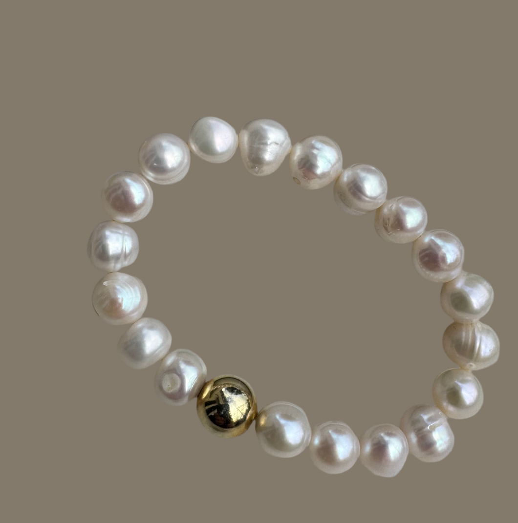 The fresh water pearl bracelet has white potato shaped pearls on elastic.