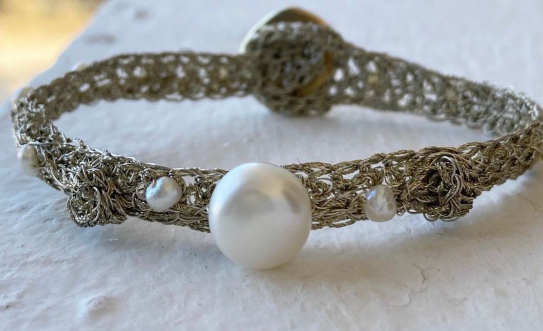 The Ioánna pearl bracelet has a 8mm lustrous fresh water pearl at the centrepiece and 2mm fresh water pearls next to the centrepiece. It Is intricately crocheted, designed and expertly handmade using special sterling silver and gold thread. A unique artistic bracelet that will suit most occasions.