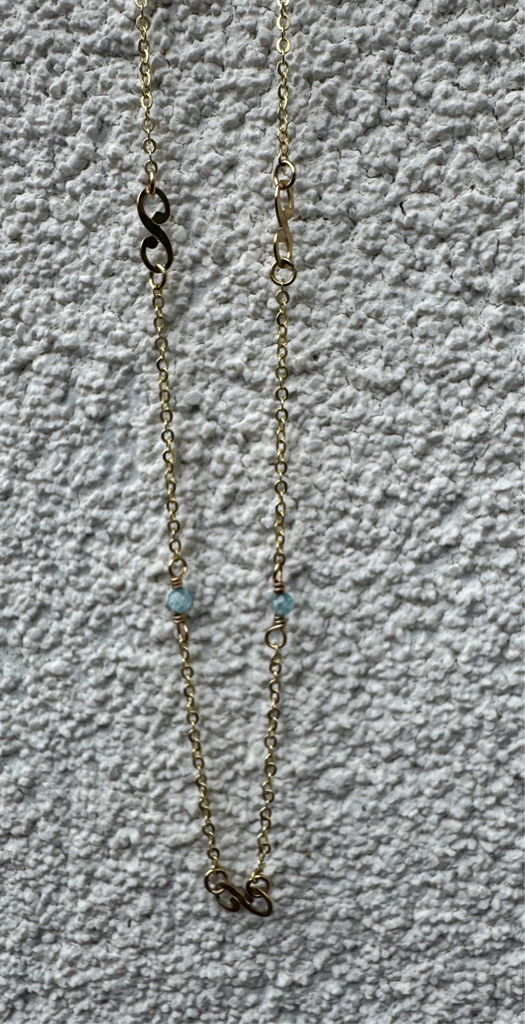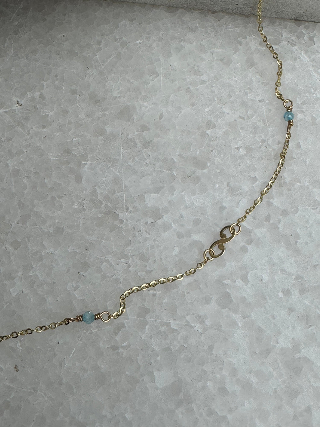 The 9k gold Apiro-infinity necklace is fine, dainty and timeless. Four tiny 2mm aquamarine beads add a touch of colour to this stunning necklace. Length of necklace 42cm with shortening ring at 39cm.