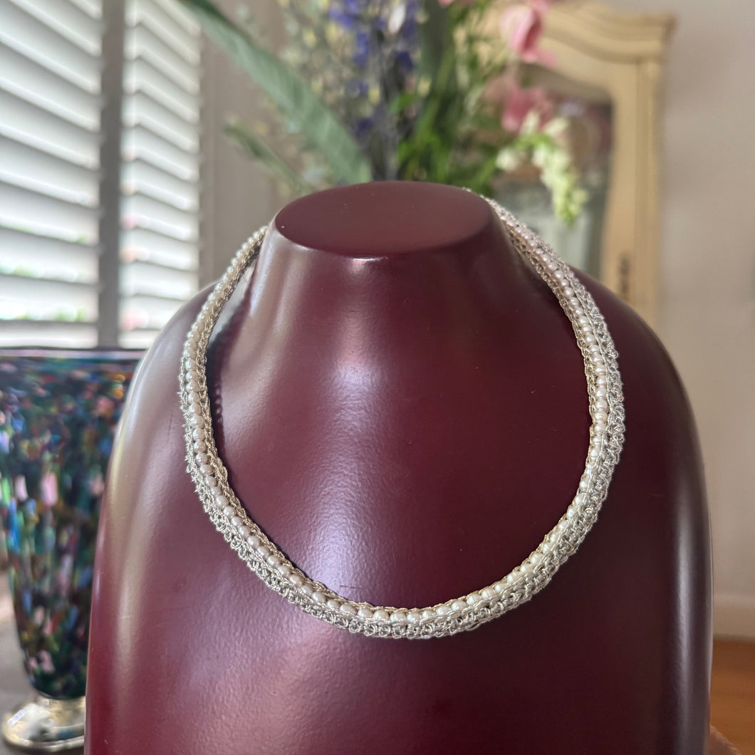 The Calista collier is strikingly beautiful and intricate. This bespoke Collier features three simultaneous strands, one made of sterling silver thread, the other strand made in tiny freshwater pearls 3mm diameter and the third strand is in special gold thread.