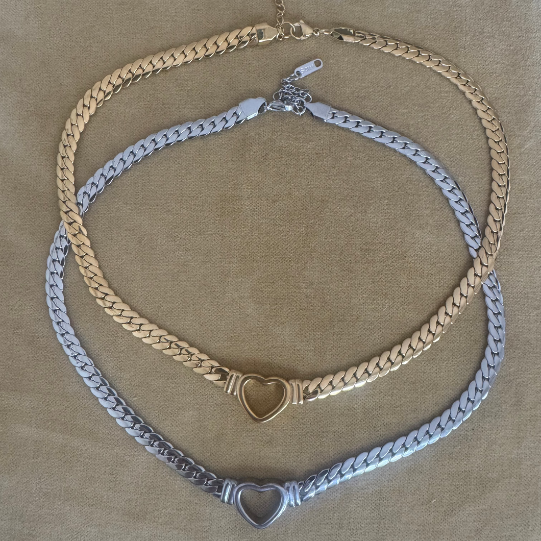 The Casi curb collier is strikingly beautiful and stunning. 38cm in length with an additional 6cm extension chain. Width of collier 6mm. Available in gold over stainless steel and silver over stainless steel.