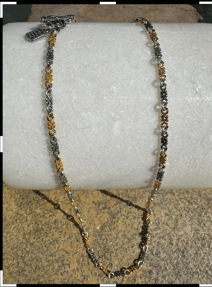 The ‘Corinth’ chain/necklace is handmade in Greece and has detailed links with a beautiful fob clasp. Wear this gorgeous necklace solo or with your favourite pendant. 925 sterling silver and 22k gold vermeil over sterling silver. Length 45cm