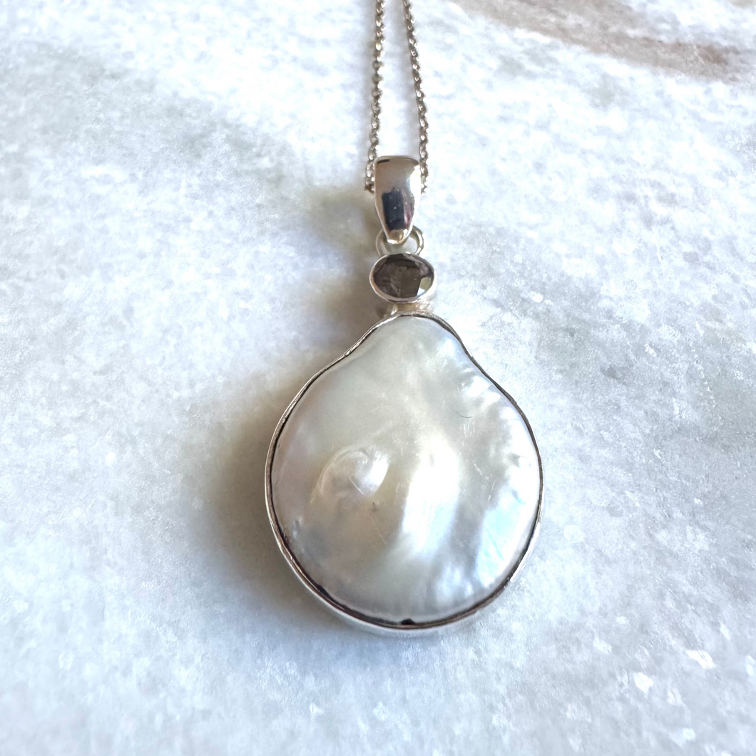 The mabe pearl with Smokey quartz is a beautiful versatile piece for day or night. Handcrafted in Sterling silver, fresh water pearl and Smokey quartz. The long cable chain is 60 cm in length.