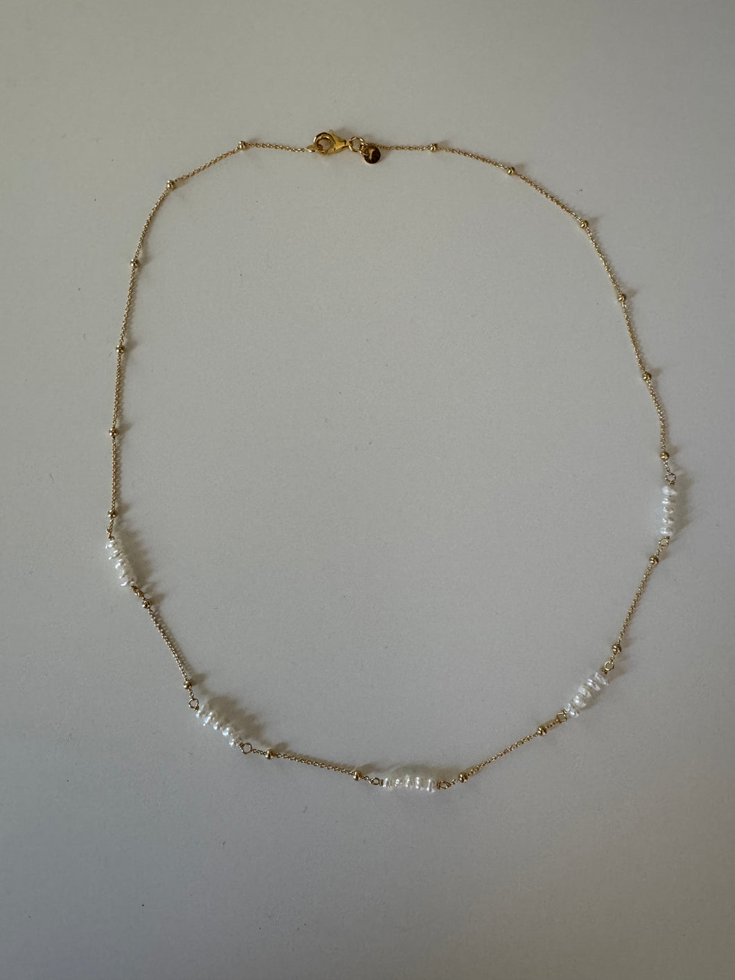 The petite fresh water pearl necklace is dainty and perfect to wear every day. The ball chain is 14k gold vermeil over sterling silver. A timeless and beautiful piece to wear solo or layered with other necklaces. Length 40-45cm adjustable.