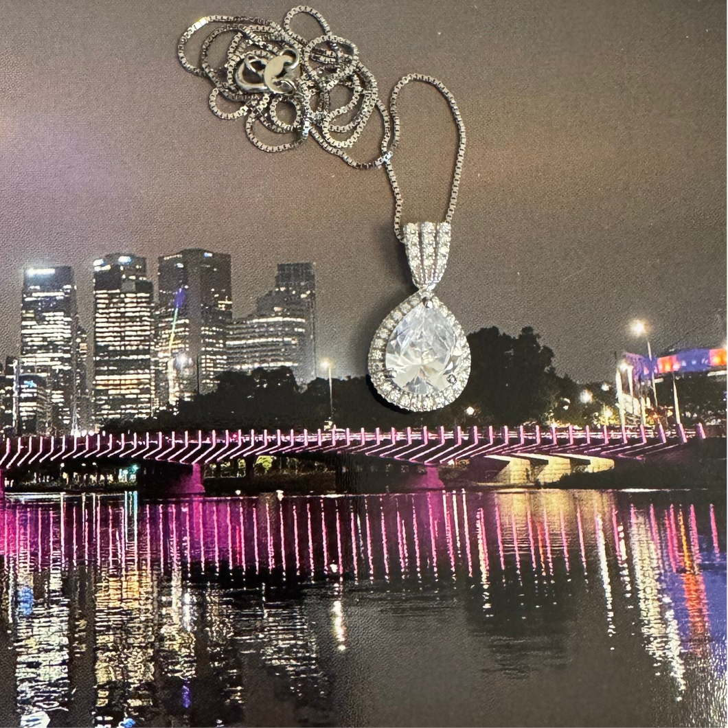 The sparkly marquise necklaces features a marquise shaped cubic zirconia pendant measuring 20X10mm on a fine chain. All 925 sterling silver silver over rhodium plated. Length of chain 38cm.