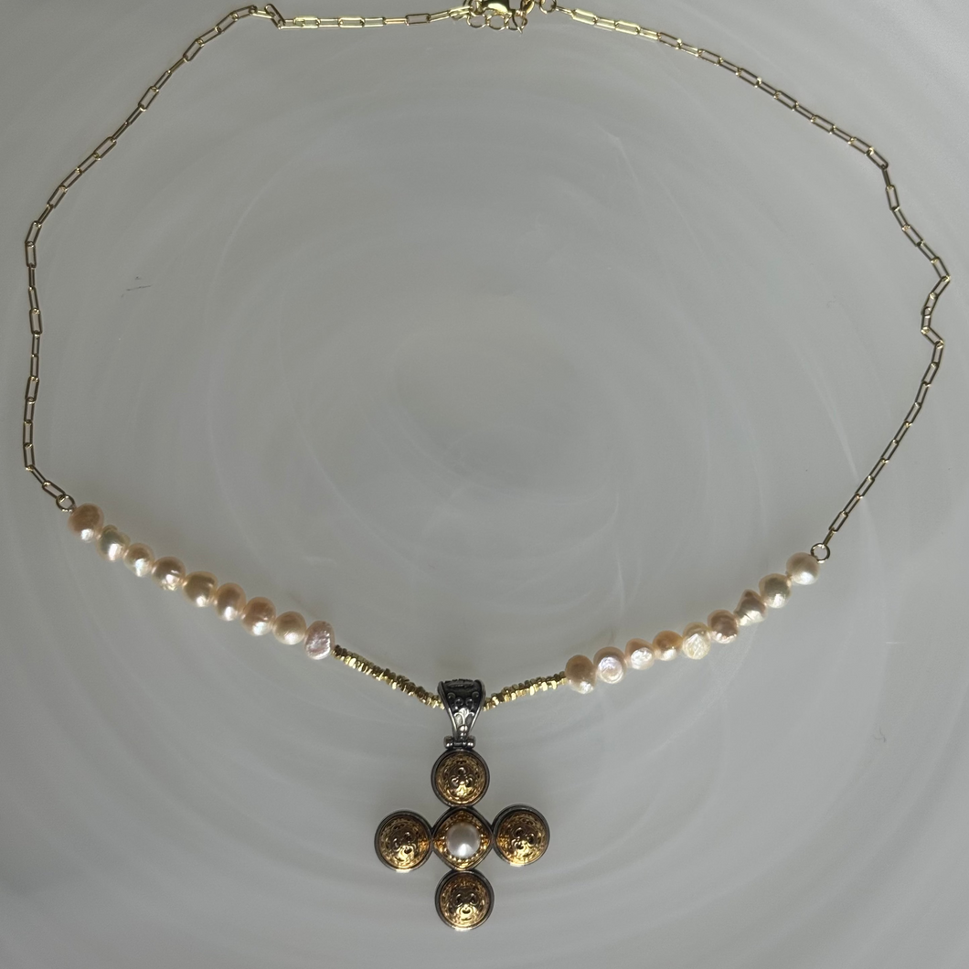 The gold filigree and fresh water pearl Byzantine cross is beautifully hand made in Greece with exceptional craftsmanship. 22k gold vermeil over 925 sterling silver. This cross is sure to stand out from the rest.