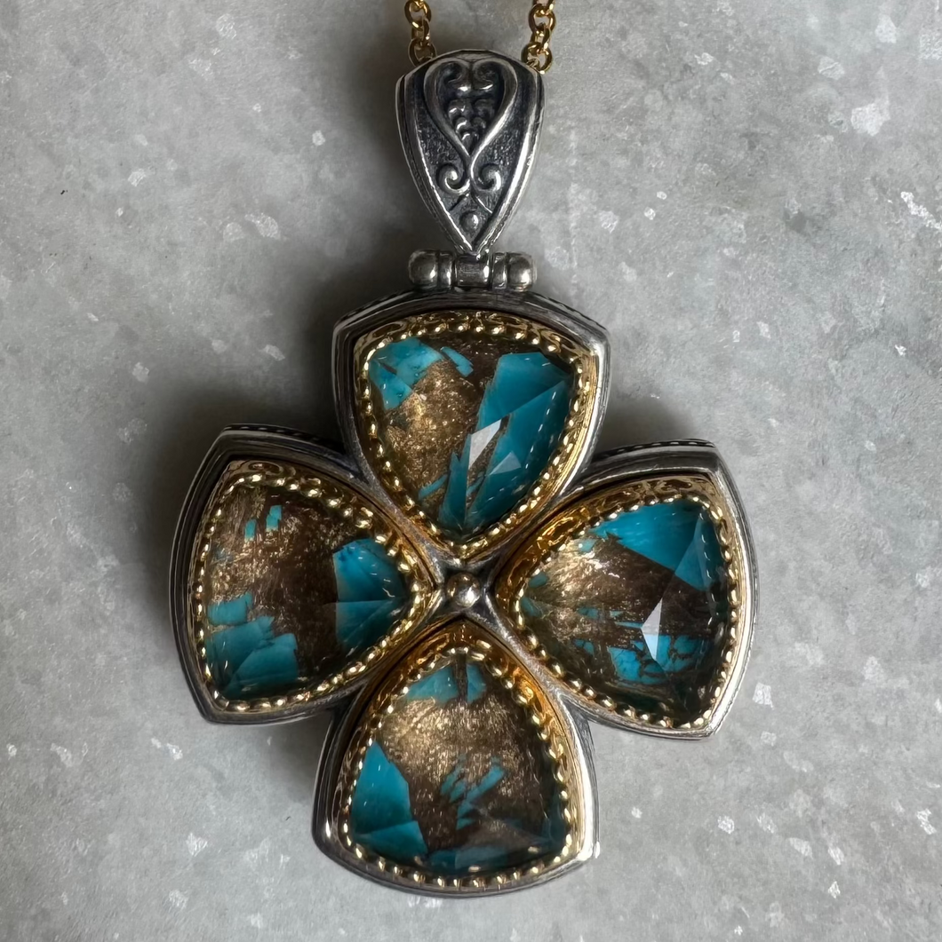 The Vólvi (Βόλβη) Byzantine cross is semi precious, hand made and beautiful. Measuring 40mmX30mm (including bail) This stunning cross is also reversible. The filligree on the opposite side of the doublet semi precious stones are unique and detailed. All 925 sterling silver with 22k gold vermeil detail around the semi precious stones.