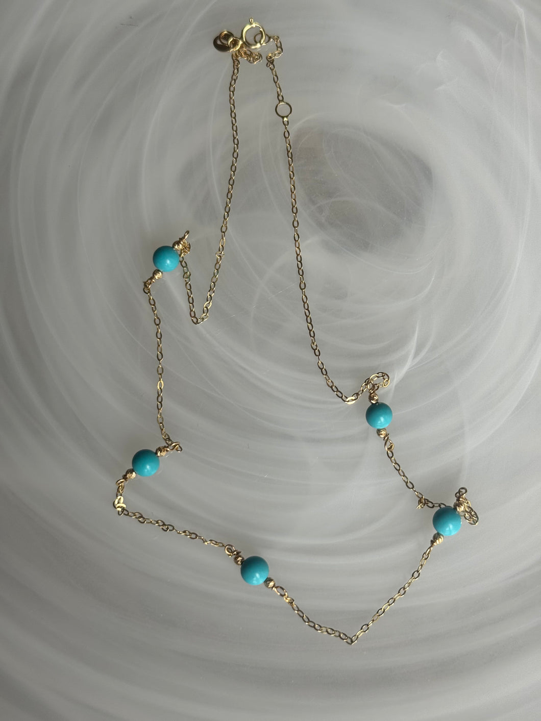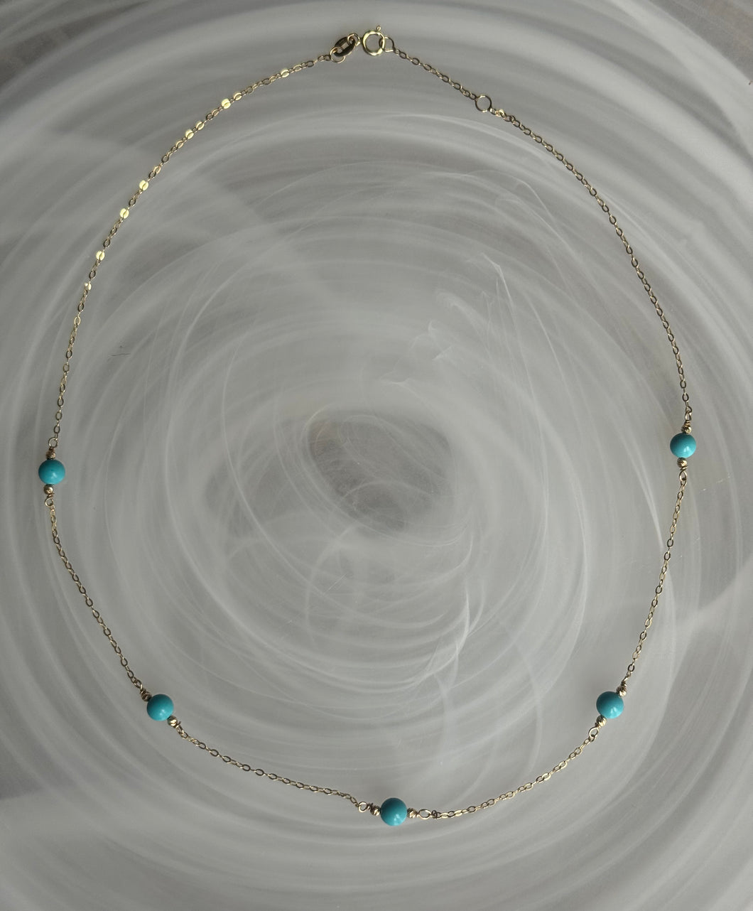The turquoise cabochon necklace features 5 genuine turquoise cabochon beads at 6mm each attached to a 14k gold cable chain. This timeless necklace is perfect to wear on a daily basis to brighten up your look. Weight 2 grams. Length of necklace 45 cm with a shortening ring at 40 cm.