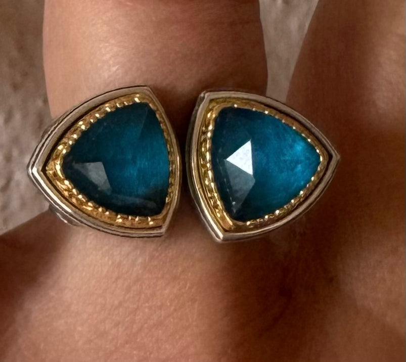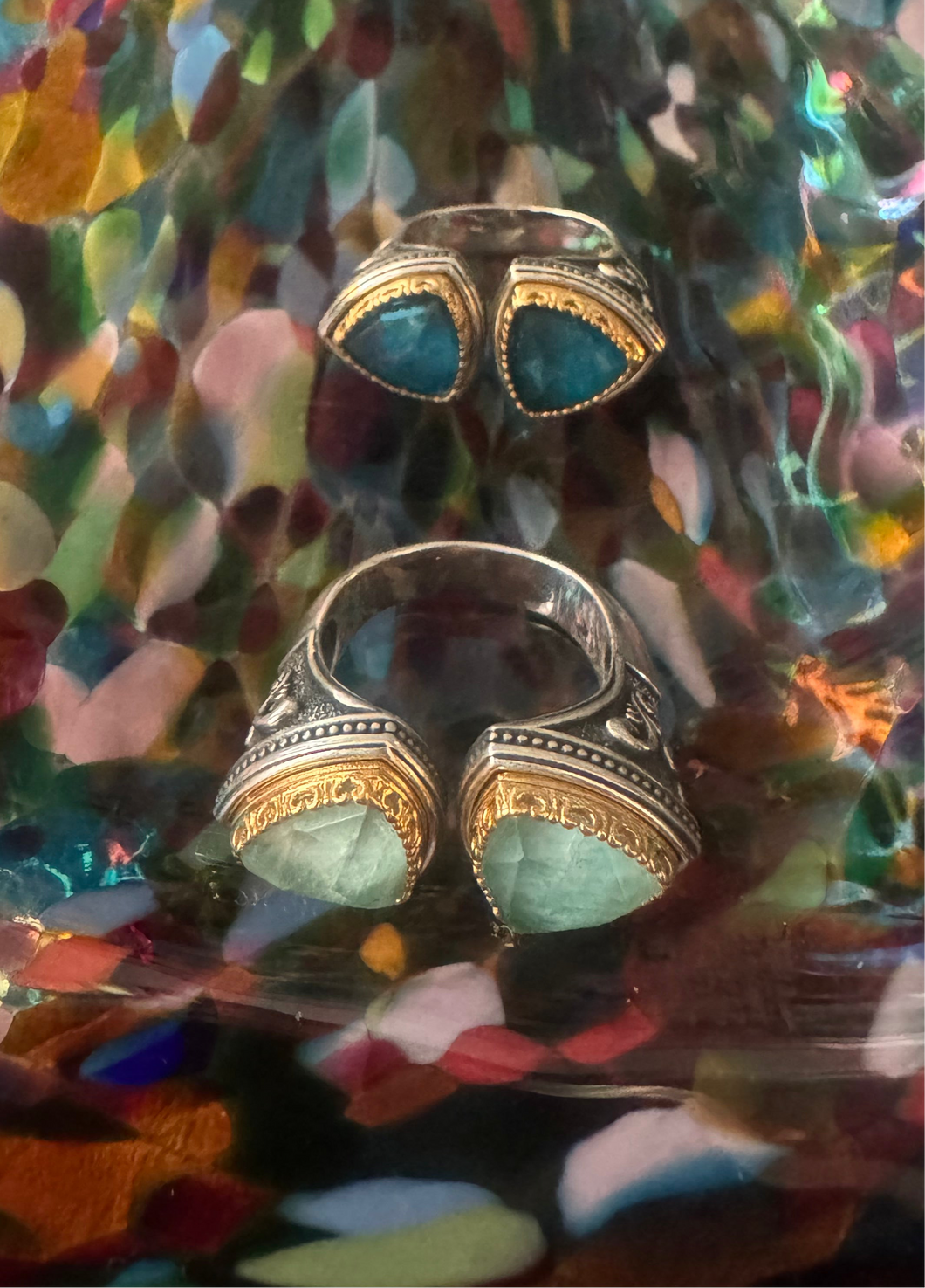 The Delphina ring is beautifully handmade from Greece and part of our Byzantine collection. Two triangular shapes are featured in the centrepiece. Each gem is 12mm with detailed filigree of 24k gold around the semi precious stones. A perfect statement piece for those who adore colour and beauty. Available in apatite and amazonite.