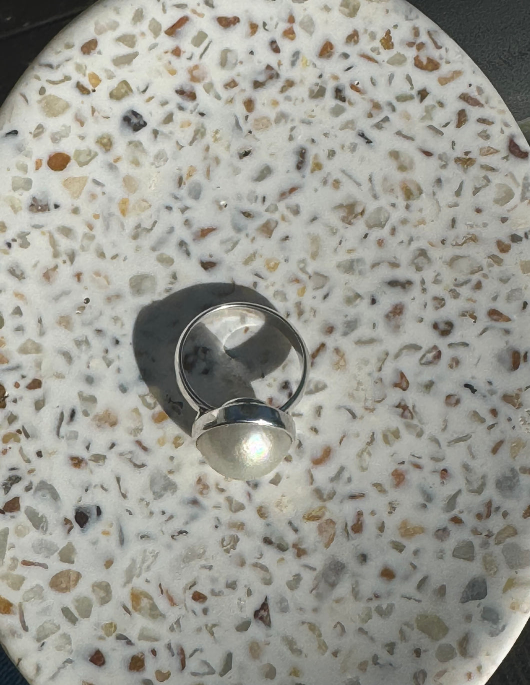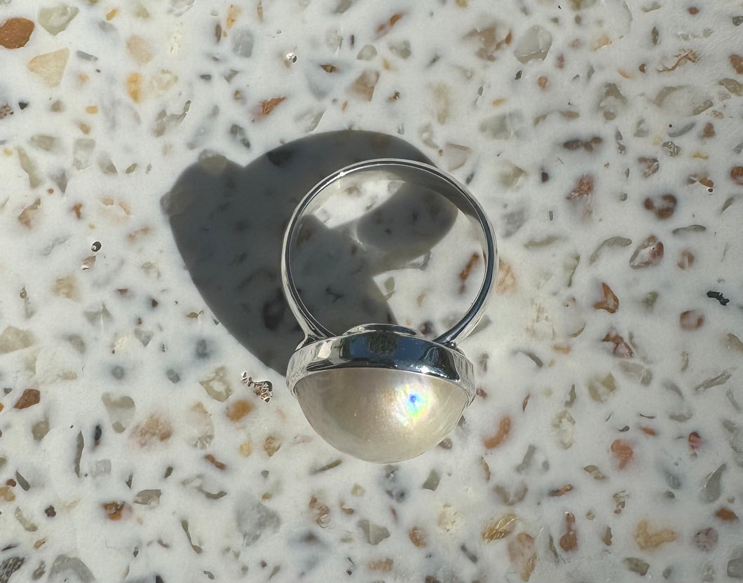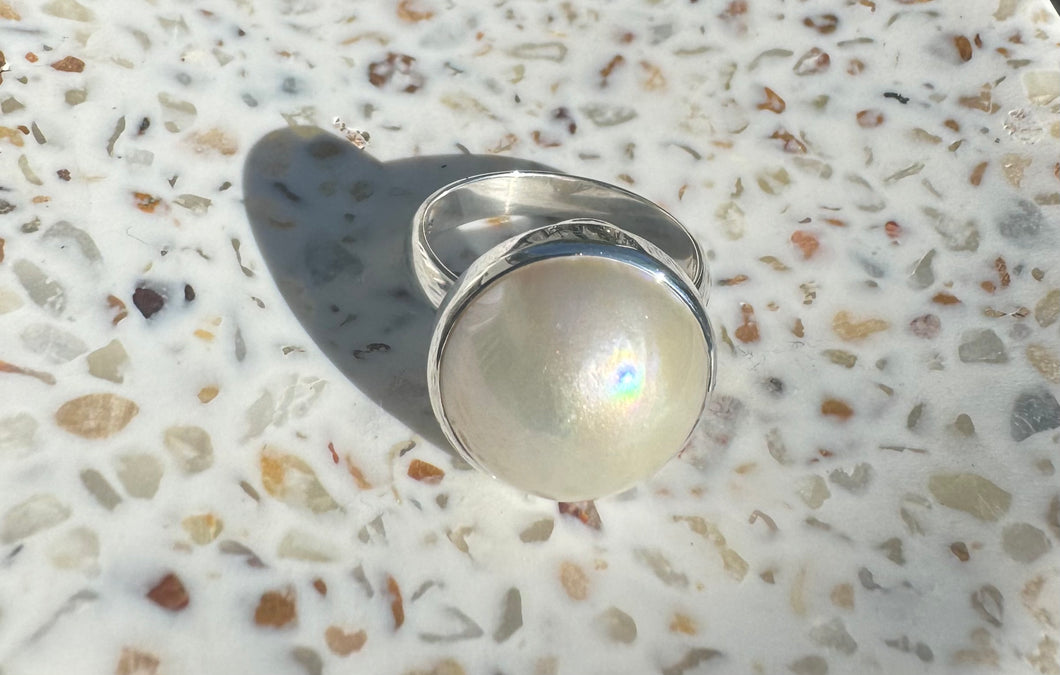 The white mabe pearl ring is illuminous and bold. Set on 925 sterling silver this ring is simply classic  and the perfect ring for every day wear.