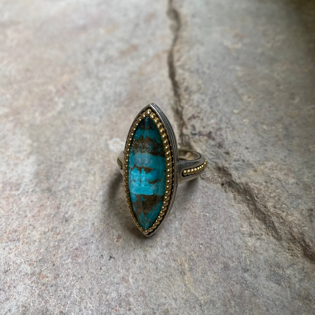 The ‘Epirus’ ring is sleek, classic and timeless. 35x 10mm in diameter a duplet turquoise semi precious centrepiece, 22k gold vermeil over 925 sterling silver. Hand made in Greece. Available in size 8