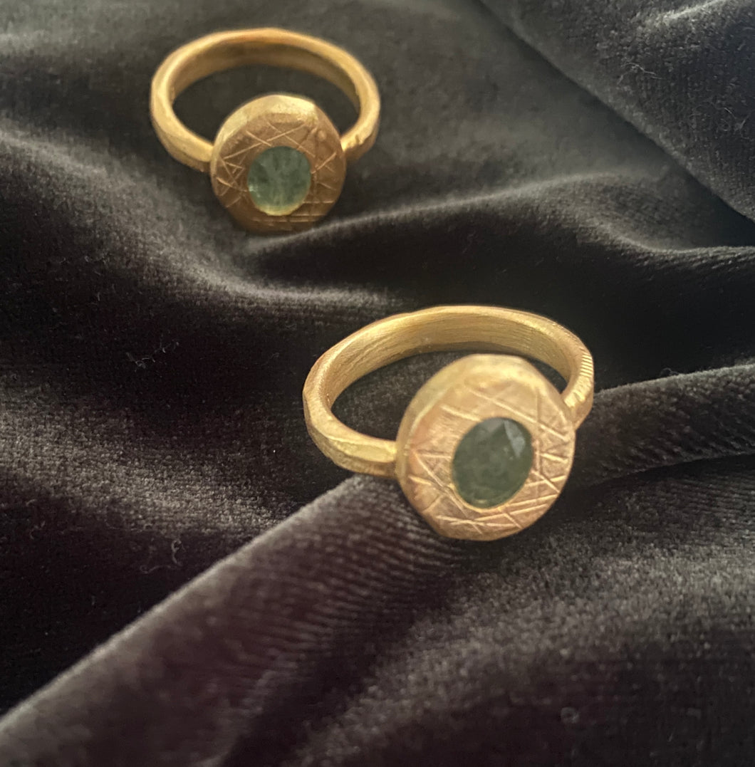 The ilios-sun ring, in 22k brushed gold vermeil over sterling silver is a perfectly comfortable every day ring. The oval setting has a lustrous strawberry quartz centrepiece 20mm in diameter. Available in size 7