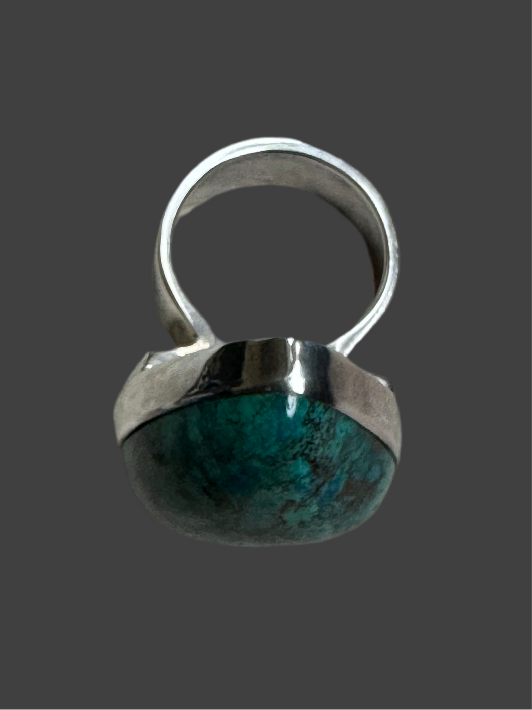 The Trigono Triangolo big bold turquoise ring is unapologetically chunky and a statement piece. The semi precious stone is 30mm dimensions. All solid sterling silver with a wide 7mm band. Hand made in Italy. Ring size 7.5
