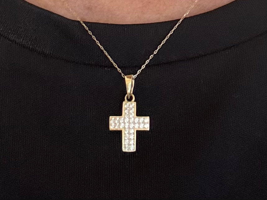 The 14k gold ‘Marina’ square shaped cross features 30 white sapphires. Total weight grams 0.89. This solid gold timeless crucifix will shine solo or with other necklaces.