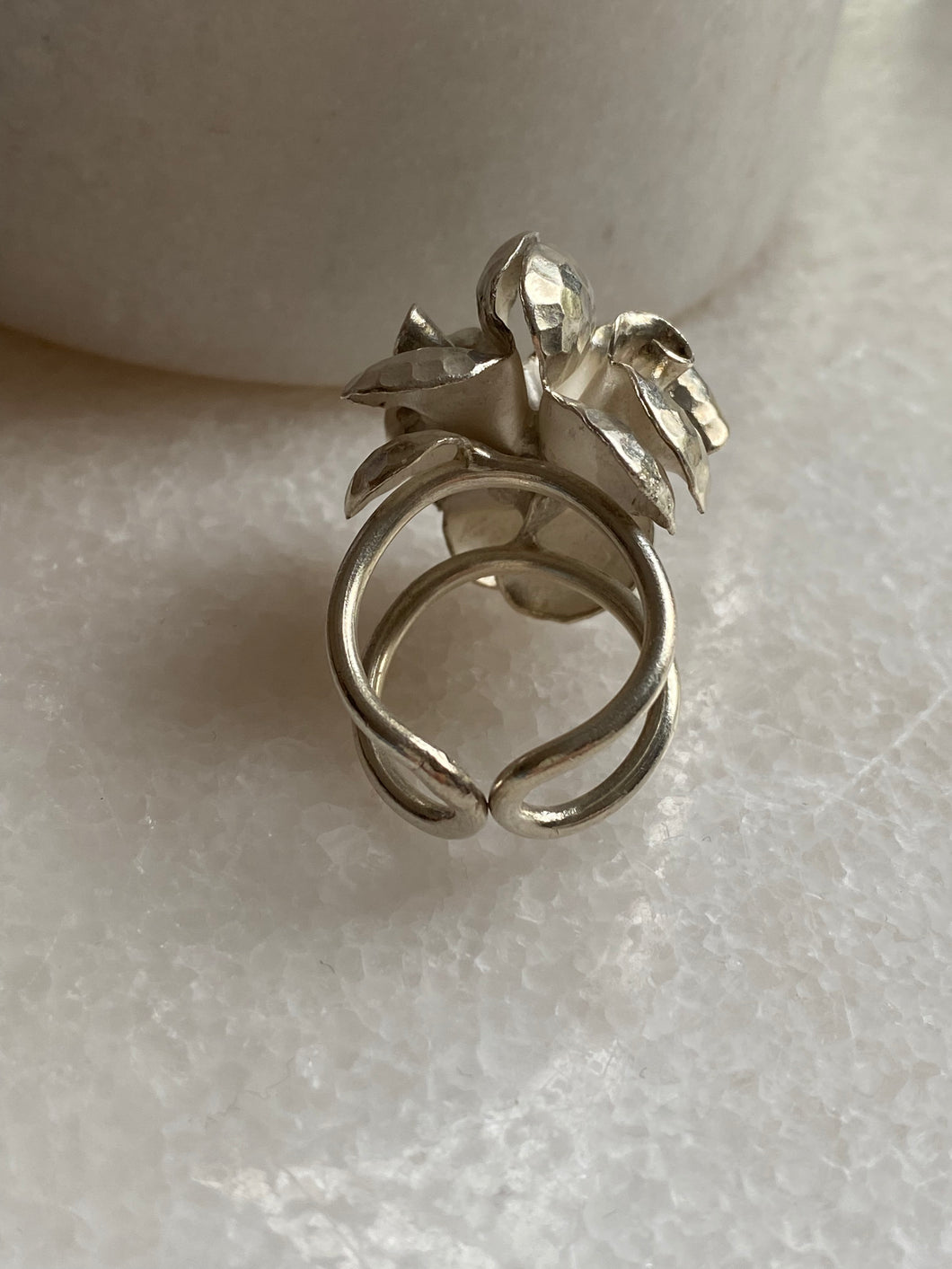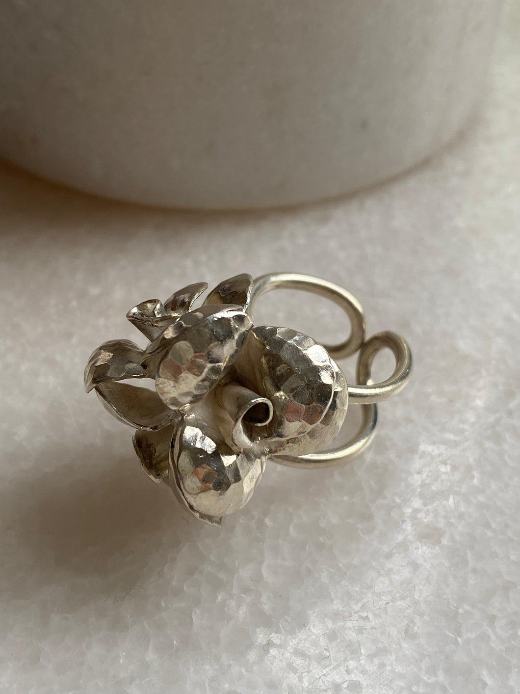 The rose ring is a handmade hammered piece with a stunning centrepiece all solid 990 silver. This artistic ring stands out from the rest. Dimensions of centrepiece rose 30x20 mm. Adjustable in size.